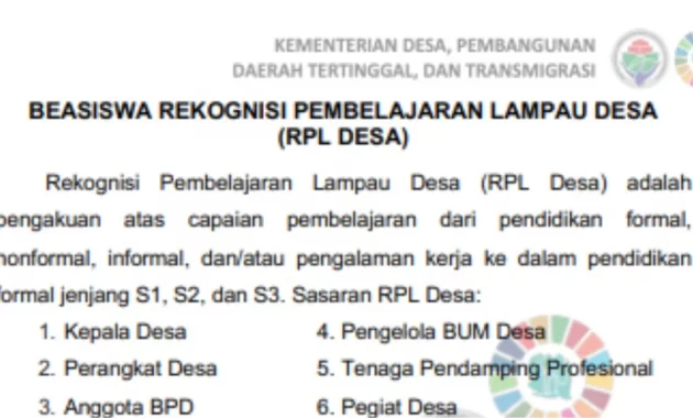 Rekognisi Pembelajaran Lampau Desa (RPL Desa) adalah pengakuan atas capaian pembelajaran dari pendidikan formal, nonformal, informal, dan/atau pengalaman kerja ke dalam pendidikan formal jenjang S1, S2, dan S3.