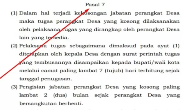 (1) : Dalam hal terjadi kekosongan jabatan perangkat desa maka tugas perangkat desa yang kosong dilaksanakan oleh pelaksana tugas yang dirangkap oleh perangkat desa lain yang tersedia.