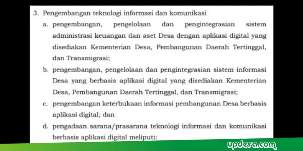 a. Pengembangan, pengelolaan dan pengintegrasian sistem administrasi keuangan dan aset desa dengan aplikasi digital yang disediakan Kementerian Desa, Pembangunan Daerah Tertinggal, dan Transmigrasi,