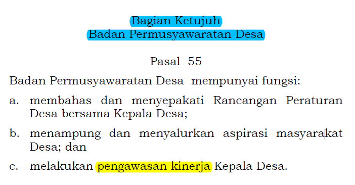 Dalam Undang-Undang Nomor 6 Tahun 2014 tentang Desa, Pasal 55, disebutkan bahwa BPD mempunyai tiga fungsi utama, yaitu membahas dan menyepakati Rancangan Peraturan Desa bersama Kepala Desa, menampung dan menyalurkan aspirasi masyarakat Desa, serta melakukan pengawasan kinerja Kepala Desa.